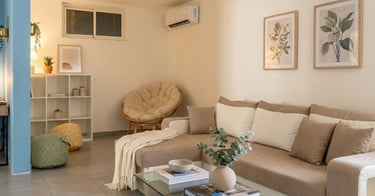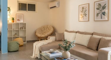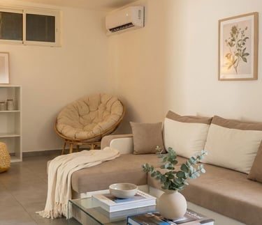 Salon spacieux et climatisé, lumineux et décoré avec soin pour une ambiance chaleureuse et apaisante. Grand canapé confortable, fauteuil détente, télévision écran plat et espace convivial pour se retrouver après une journée de découverte.
