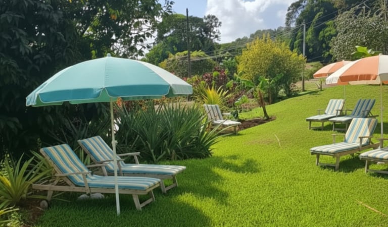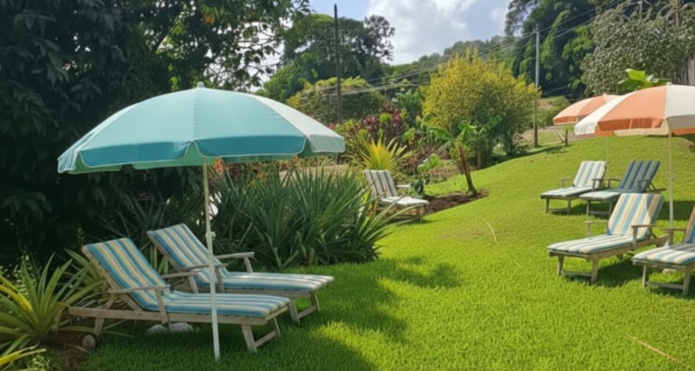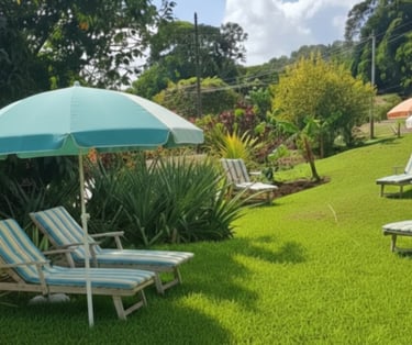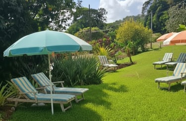 Grand jardin tropical verdoyant, soigneusement entretenu, idéal pour se détendre en toute tranquillité. Transats confortables, parasols et espaces ombragés vous permettent de profiter pleinement du soleil martiniquais.