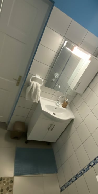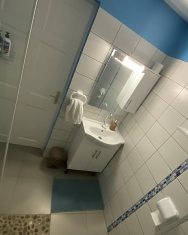 Salle de bain moderne avec douche à l’italienne, spacieuse et facile d’accès. Sol en galets, paroi en verre, lavabo avec meuble de rangement, miroir lumineux et WC. Serviettes fournies pour votre confort.