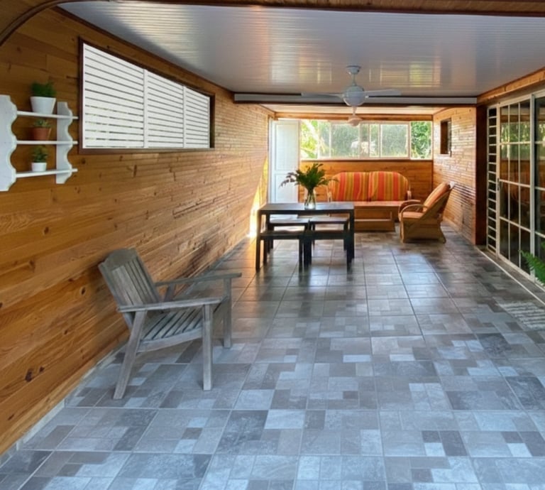 Grande véranda couverte et ventilée, véritable espace de vie supplémentaire. Aménagée avec coin salon, table à manger et assises confortables, elle permet de profiter pleinement du climat tropical à l’abri du soleil.